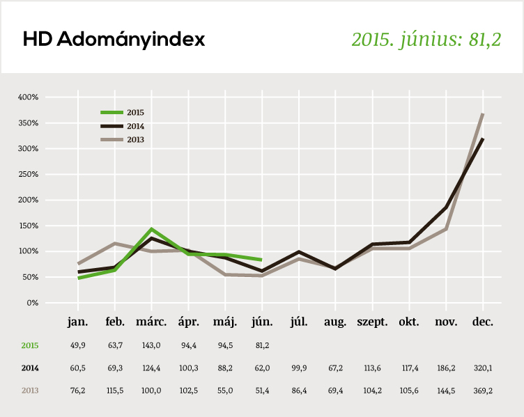 A számítás módja: az adott havi adományösszegeket a referenciaév átlagos havi adományértékével (tehát nem a referenciaév adott havi értékeivel!) hasonlítjuk össze, így az év/év fejlődés mellett képet kapunk az adományozás éven belüli, szezonális alakulásáról is.