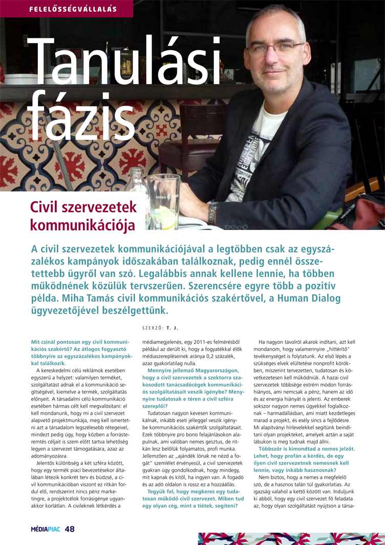 A civil szervezetek kommunikációjával a legtöbben csak az egyszázalékos kampányok időszakában találkoznak, pedig ennél összetettebb ügyről van szó. Legalábbis annak kellene lennie, ha többen működnének közülük tervszerűen. Szerencsére egyre több a pozitív példa. Miha Tamás civil kommunikációs szakértővel, a Human Dialog ügyvezetőjével beszélgettünk.